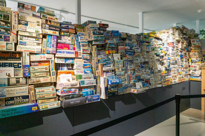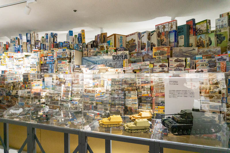 通路の両側に山のように積まれたプラモの箱はまさに「山」といった感じ。