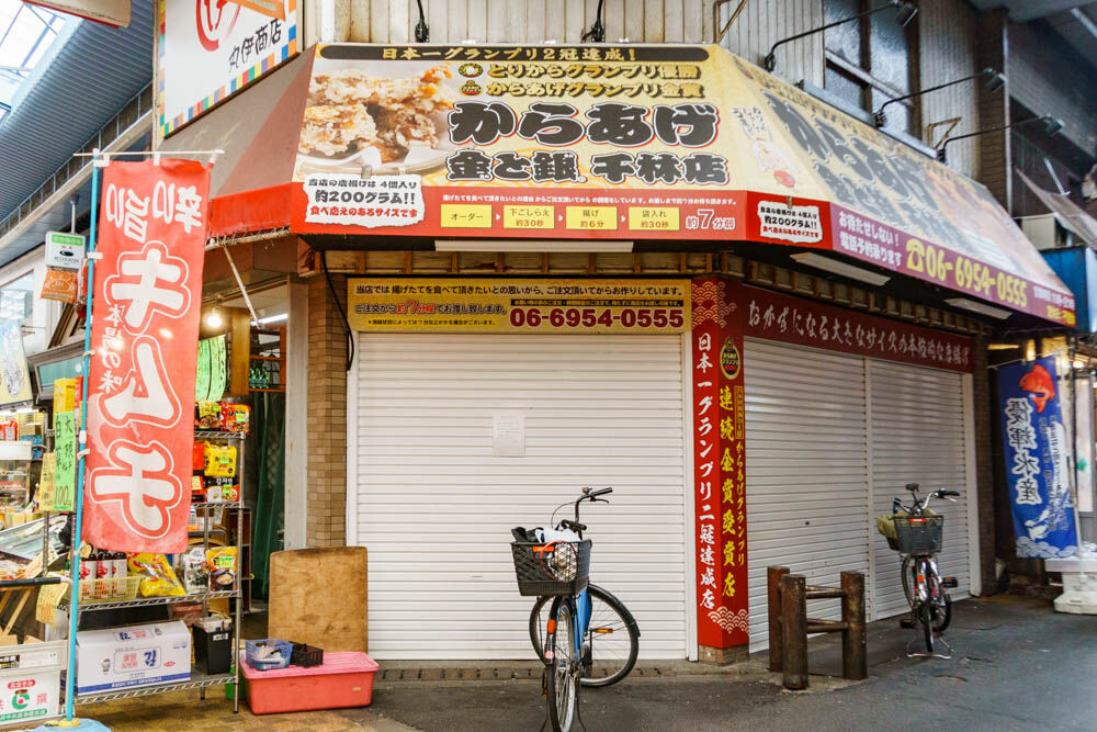 反対方向に行くと千林商店街につながります。写ってませんが左のキムチ屋さんの隣が「からあげ金と銀」。