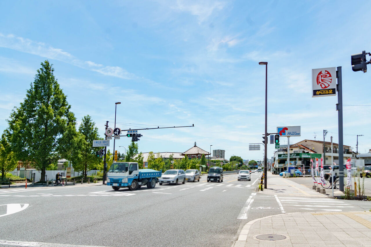 163号線沿い方面、花博記念公園北口の交差点のところです。コメダができるのは左の木が生えているあたり。