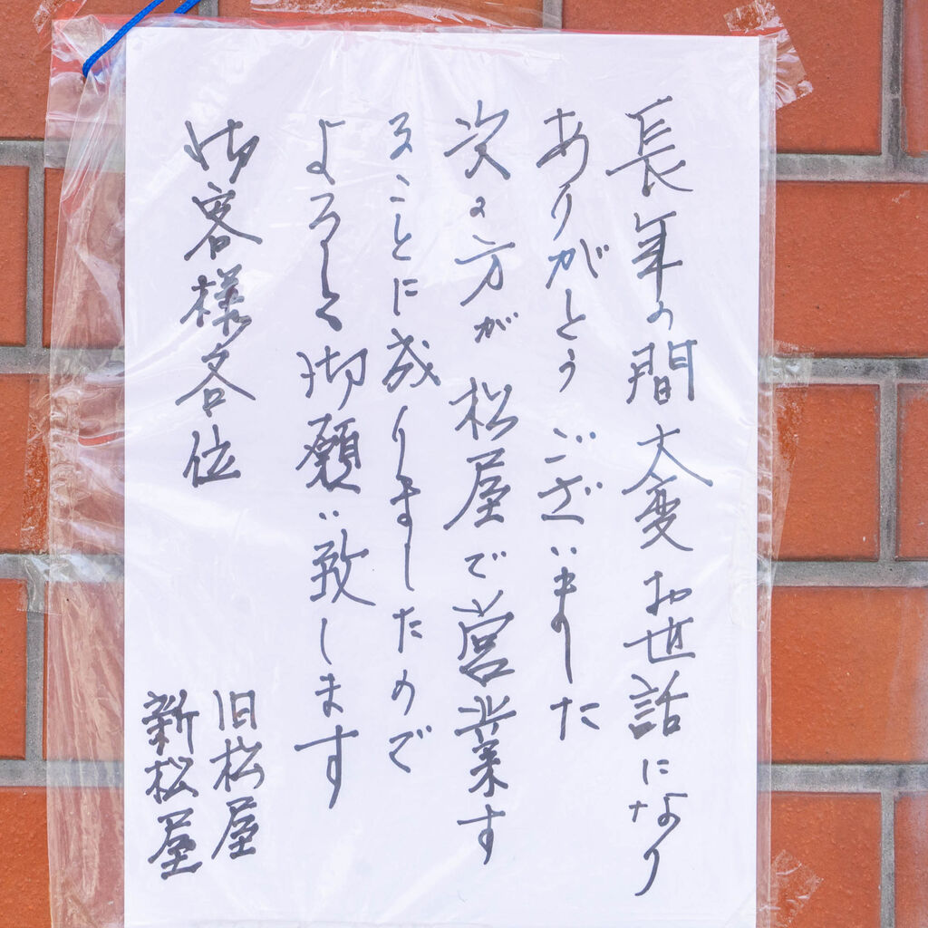 貼紙その2。旧松屋と新松屋について書かれていて、次の方にかわったことがわかります。