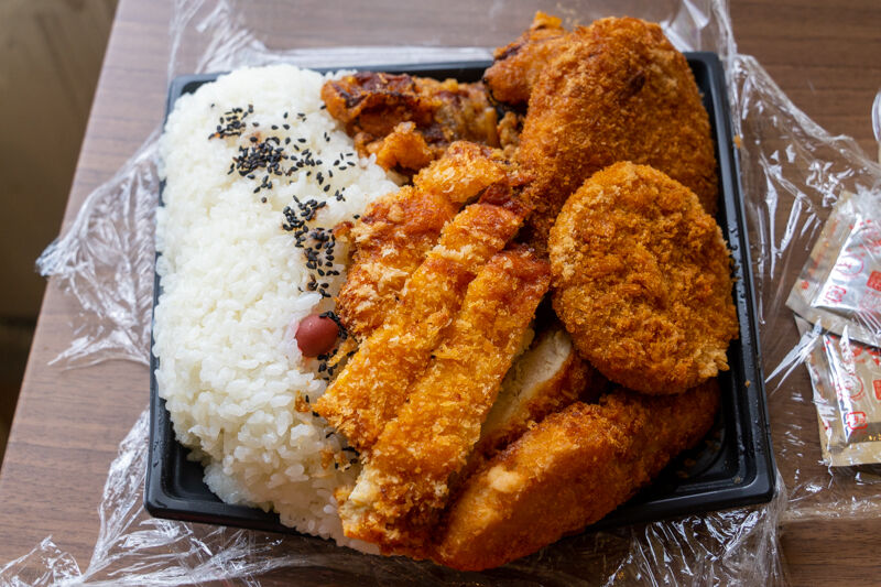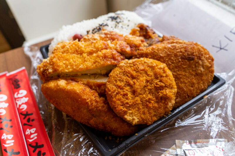 実際にスタッフが1人で食べたんですが、ごはん、とんかつ、白身フライ、メンチカツ、コロッケ、からあげ、漬物、つけ麺みたいな太麺のパスタ的立ち位置のものが入っていました。