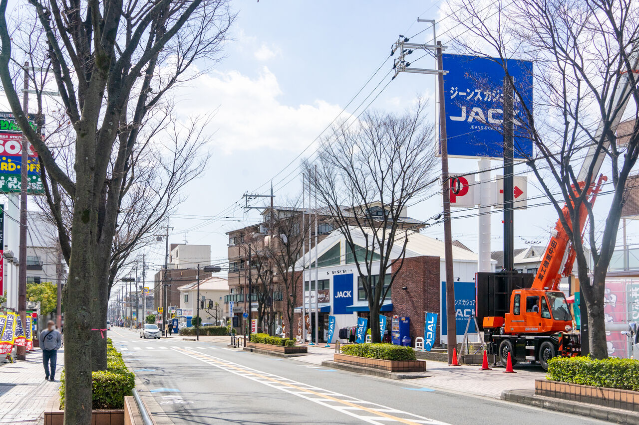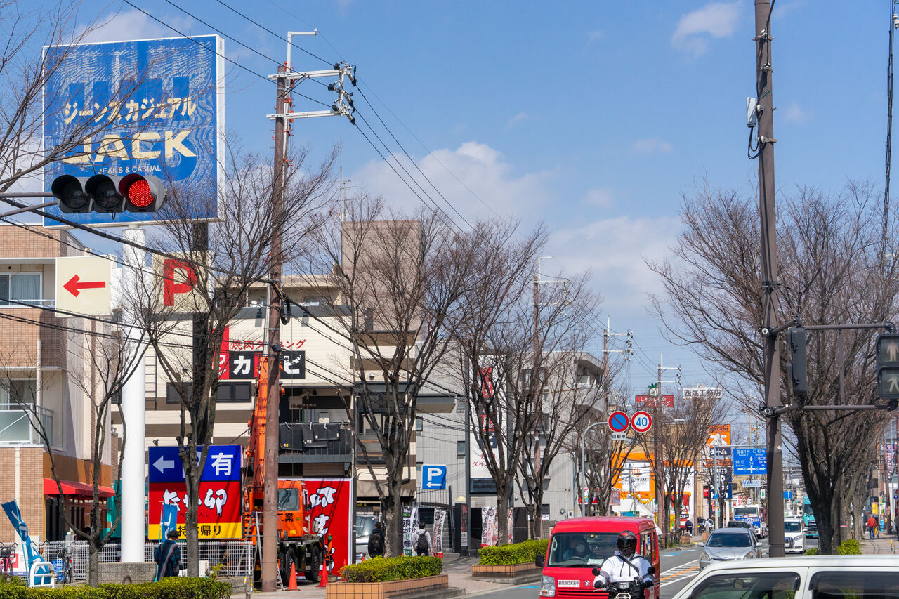こっちのとなりにはワンカルビ。進んでいくと国道163号線の交差点「試験場入口」がありまして、その周辺にはマクドナルドやしゃぶ葉、ガストなどが。もっと進んでいくと古川橋駅です。