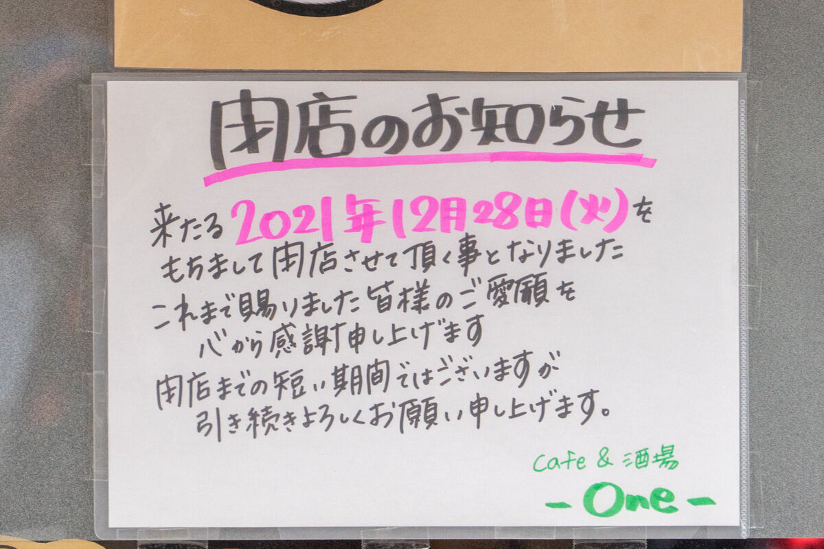 西三荘駅ちかくの「Cafe&酒場 One」が12月28日で閉店