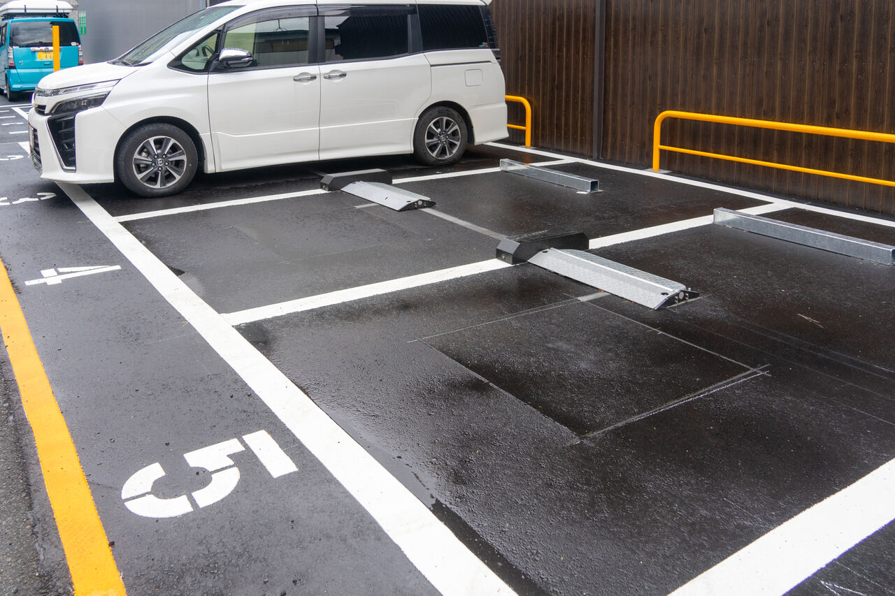 駐車台数は5台。下から板が上がってくるフラップ式のコインパーキング。