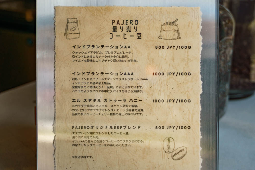 コーヒー豆の量り売りも行っている模様。Instagramによると、インド産のコーヒー豆などを取り扱っているとのこと。