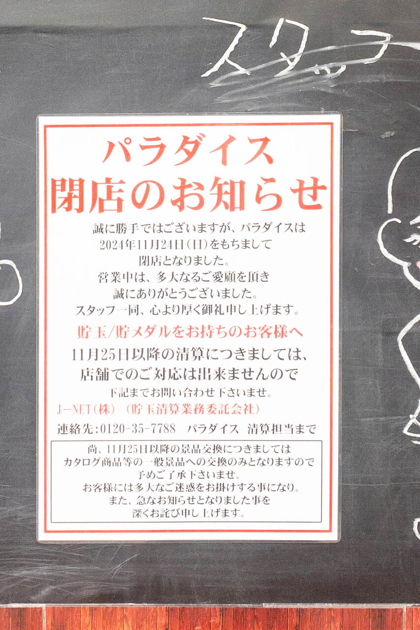 大阪メトロ千林大宮駅近くのパチンコ店「パラダイス 千林店」が閉店しています。