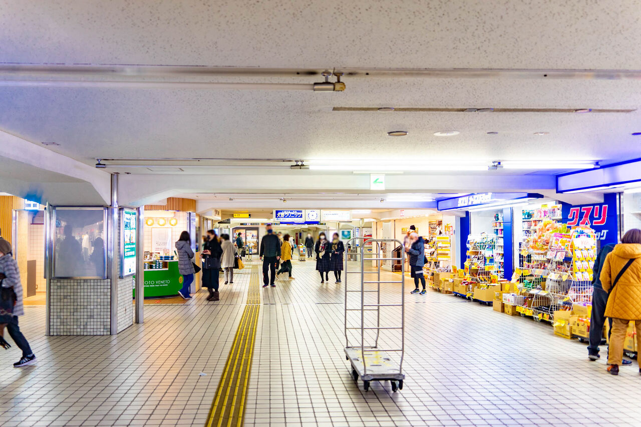お店に背をむけて撮影した写真。オーエスドラッグやユニクロ、そして改札が写っています。