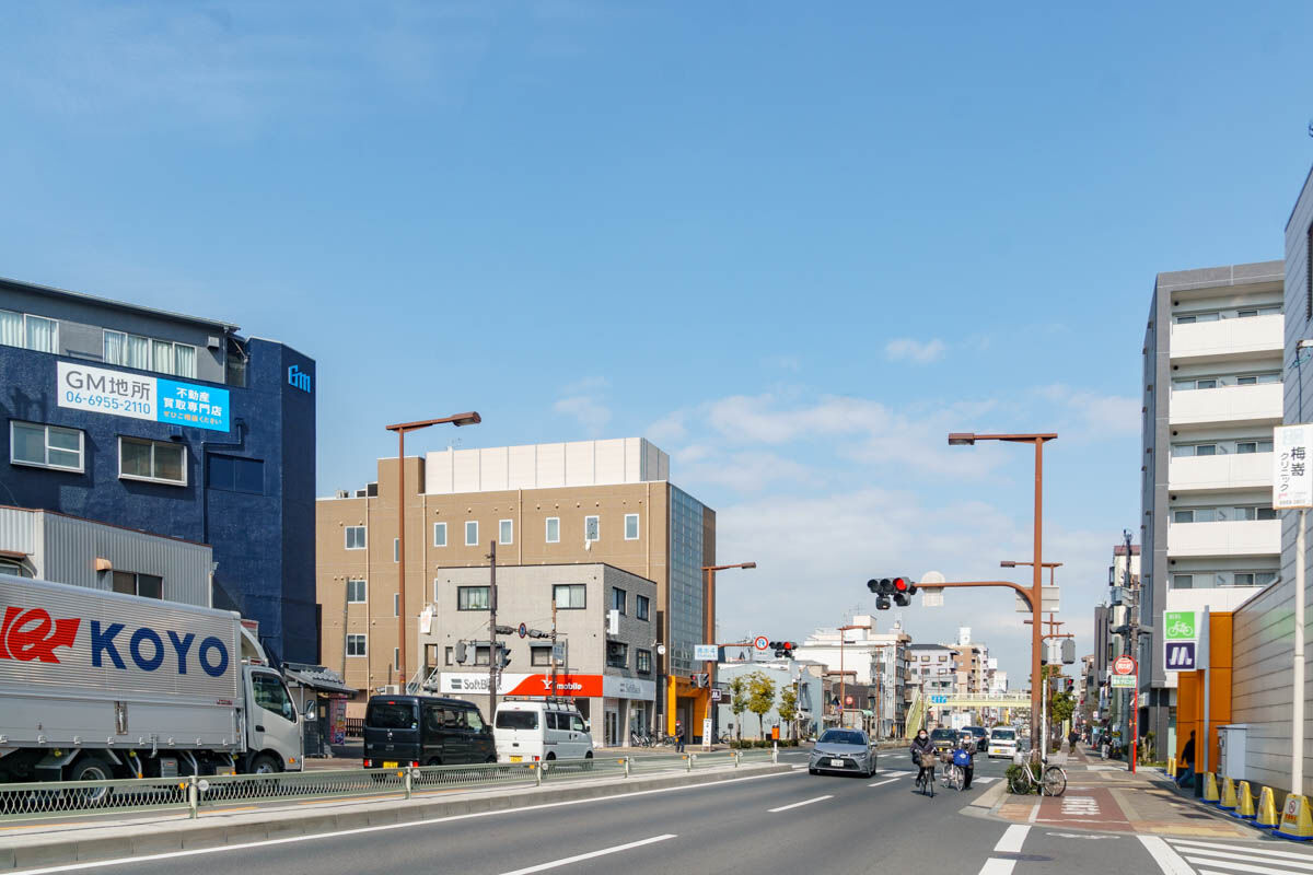 反対に行くと京阪電車の高架をくぐって大阪メトロ太子橋今市駅へ。道路向かいは大阪メトロ清水駅です。