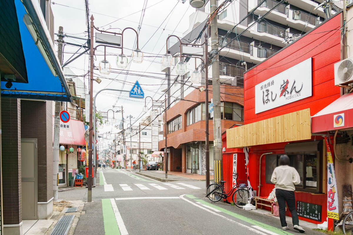 こっちに行くと住友通商店街が広がっていて、「焼肉 香里苑」などが。そのまま行くと京阪電車の高架があり、左に行くと門真市駅です。