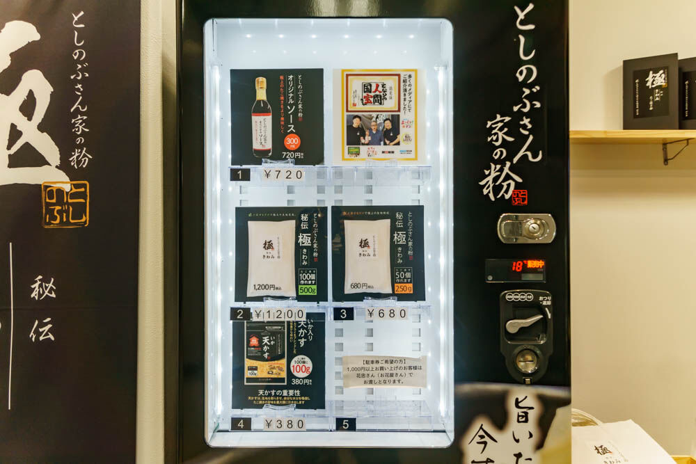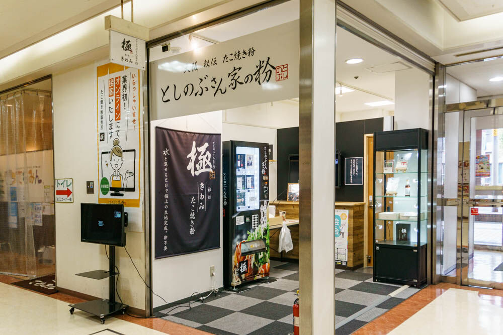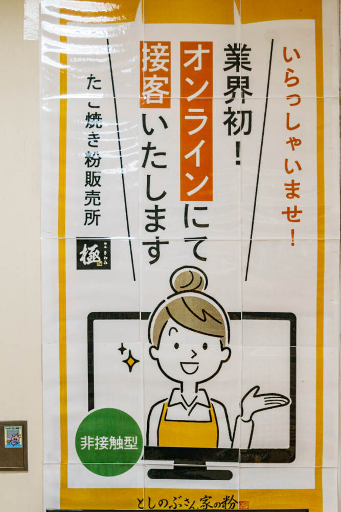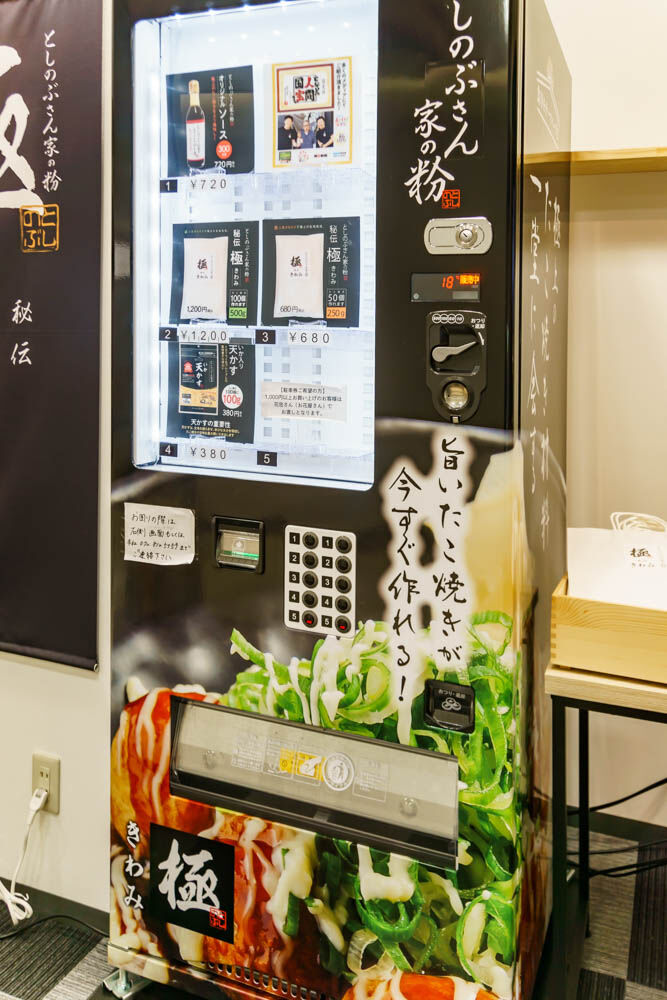 コア古川橋の「としのぶさん家の粉」にオンライン接客付き『たこ焼き粉自販機』が設置されてる