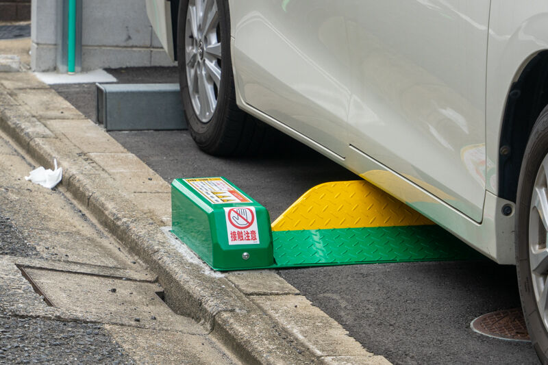 下から板があがってくるフラップ式のコインパーキング。駐車可能台数は7台です。