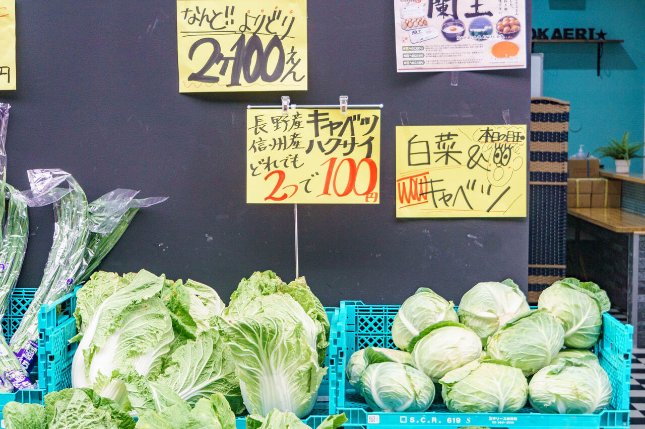 キャベツや白菜が2玉で100円!めちゃめちゃ安いんじゃないでしょうか。