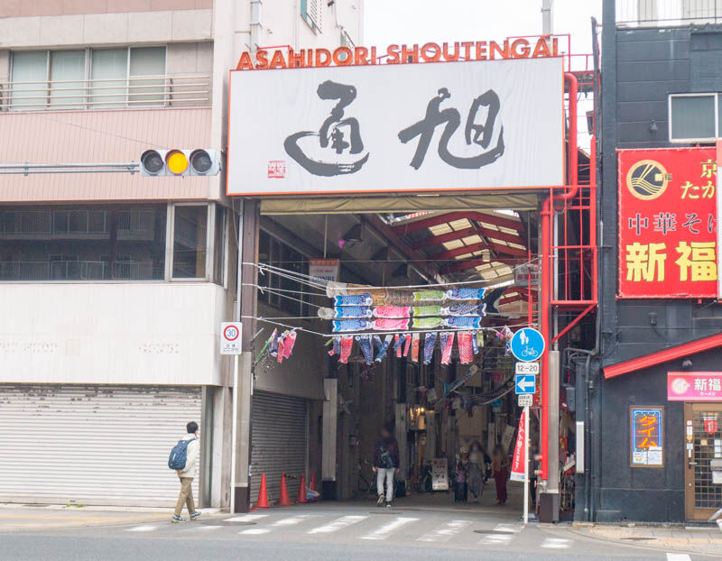 京阪本通のアーケード出入り口からこちらの他の商店街との交差点のあたりまで、旭通商店街全体にこいのぼりが並んでいます。