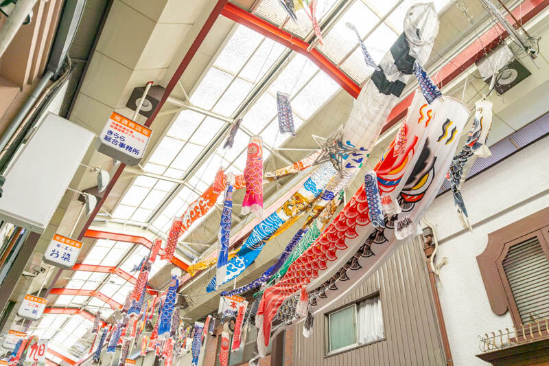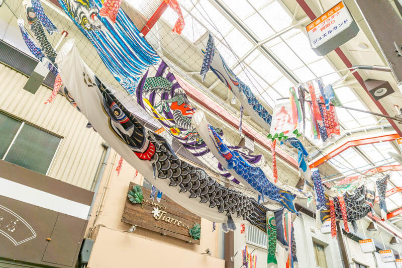 旭通商店街を泳ぐこいのぼり【もりつーフォト】