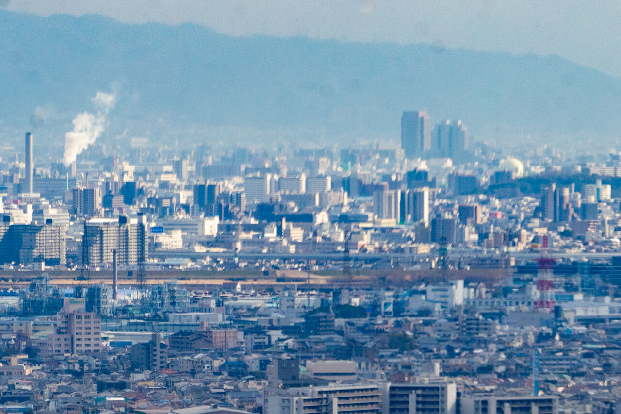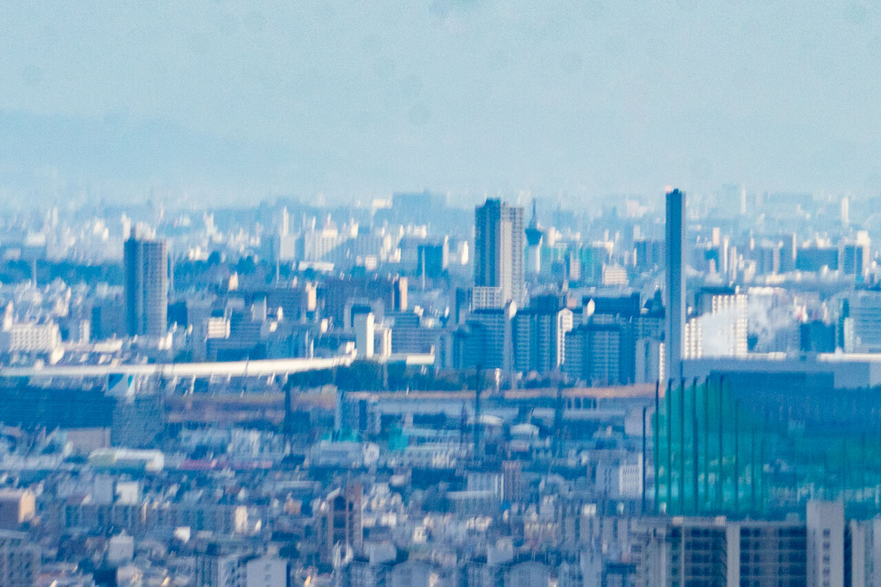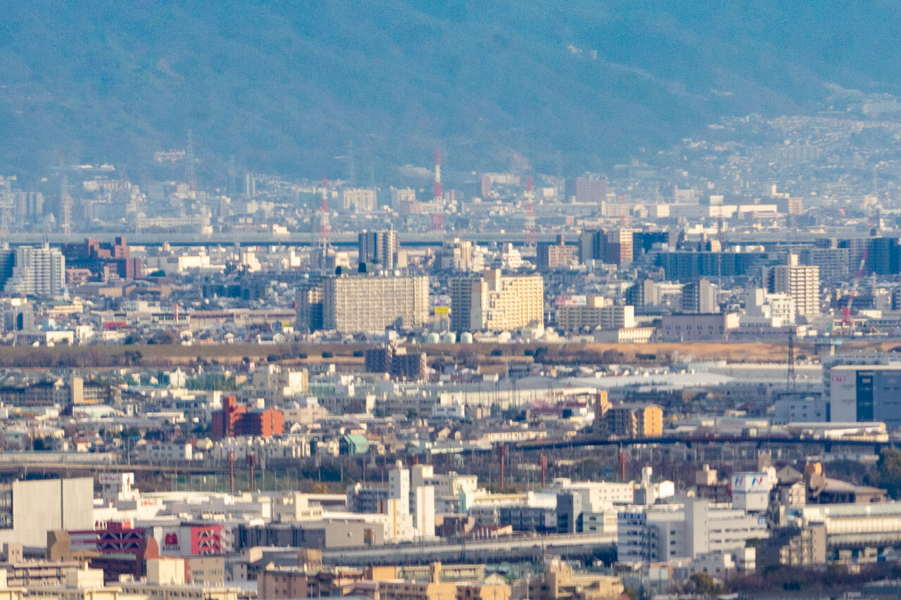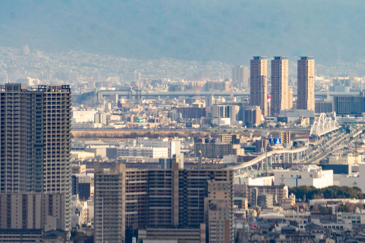 ブレててすみませんが、真ん中にある大きなマンションは守口市駅前のマンションで、その右に鶴見緑地公園の咲くやこの花館横にあるいのちの塔が写っています。