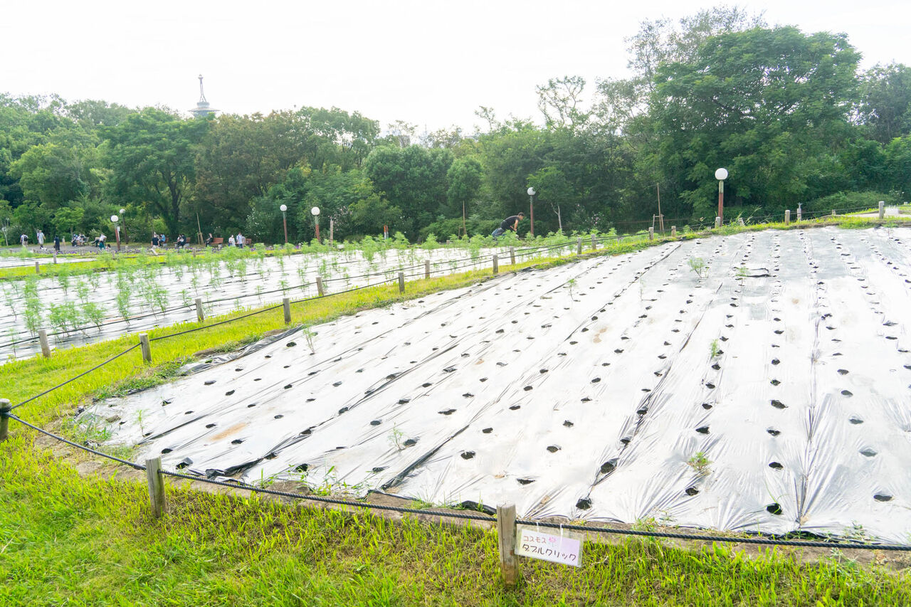 風車小屋前のコスモスはまだ。