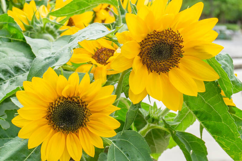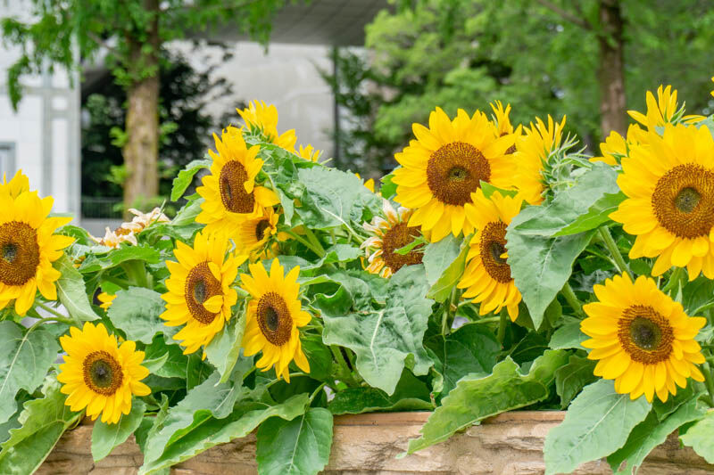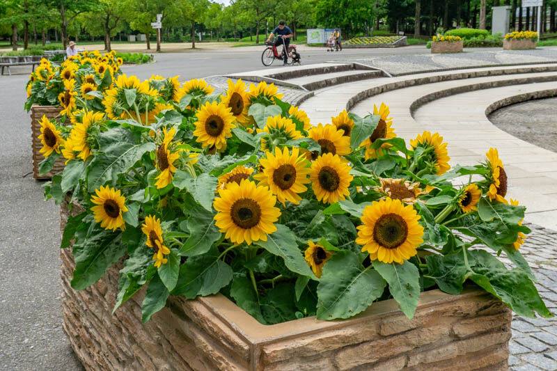 噴水の周りの花壇にひまわりが咲いていて黄色の花が遠くから見ていてもわかる印象でした。