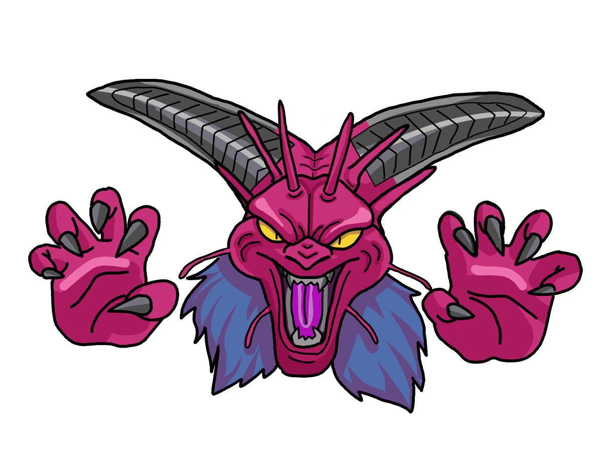 デスタムーアを知らない人に説明しますと、ドラゴンクエスト6のラスボスです。上のイラストはデスタムーア第3形態。高校生体験に来た高校生にイラストを描いてもらいました(笑)