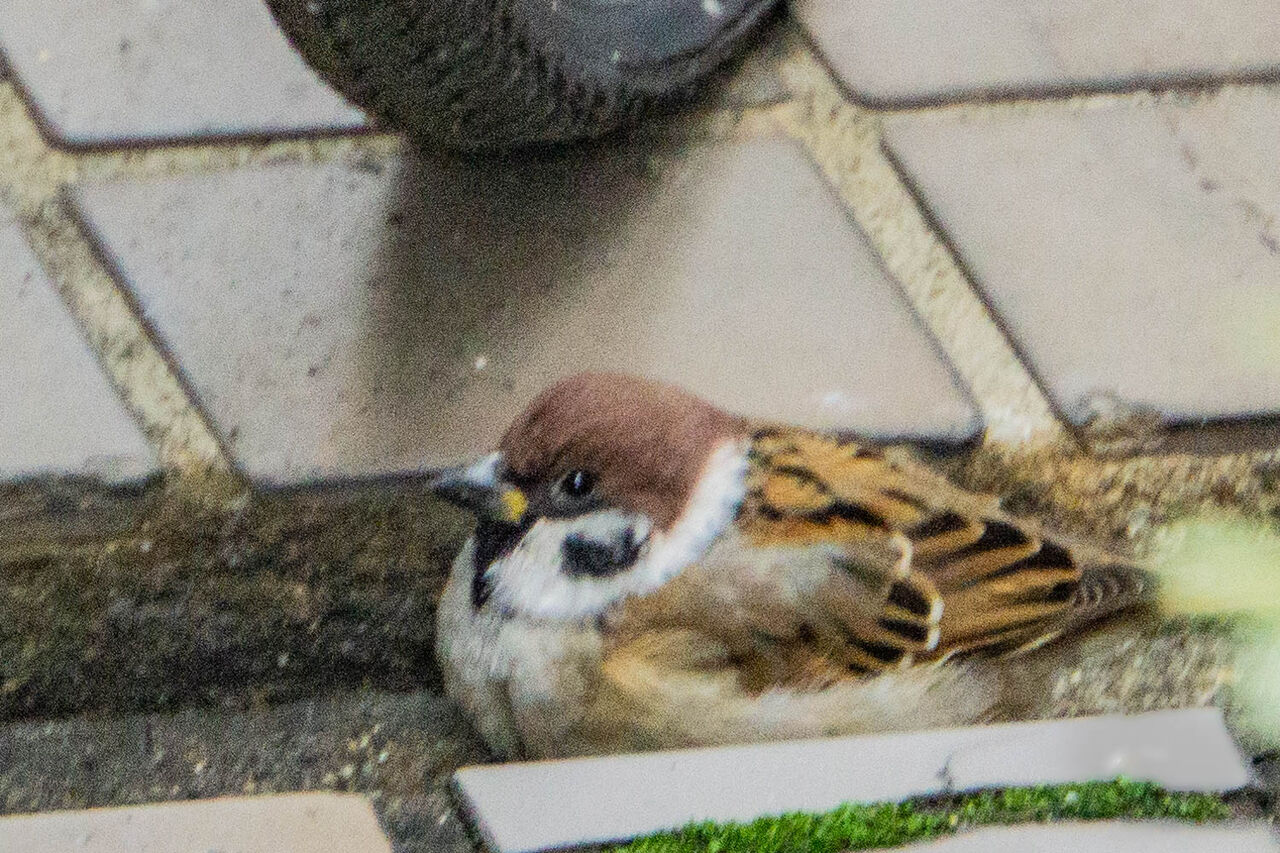 一方、一切動かないスズメも。溝に…