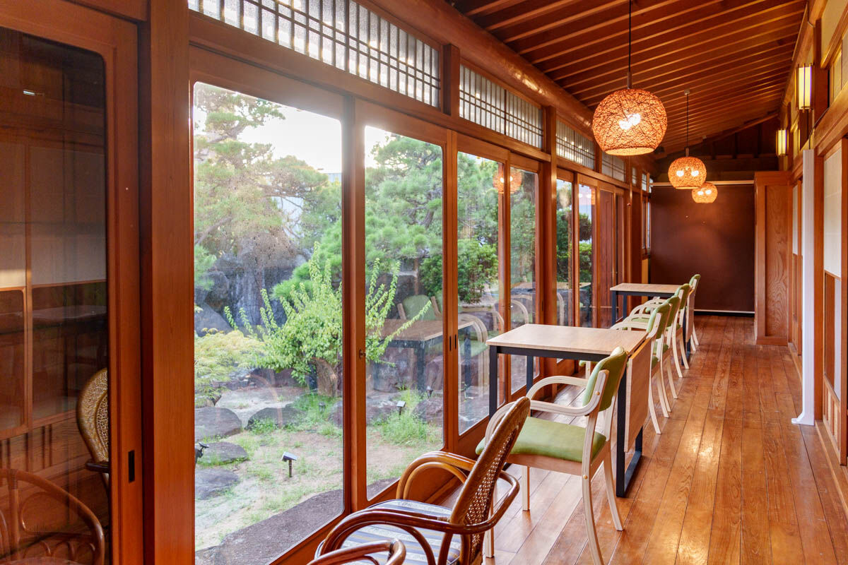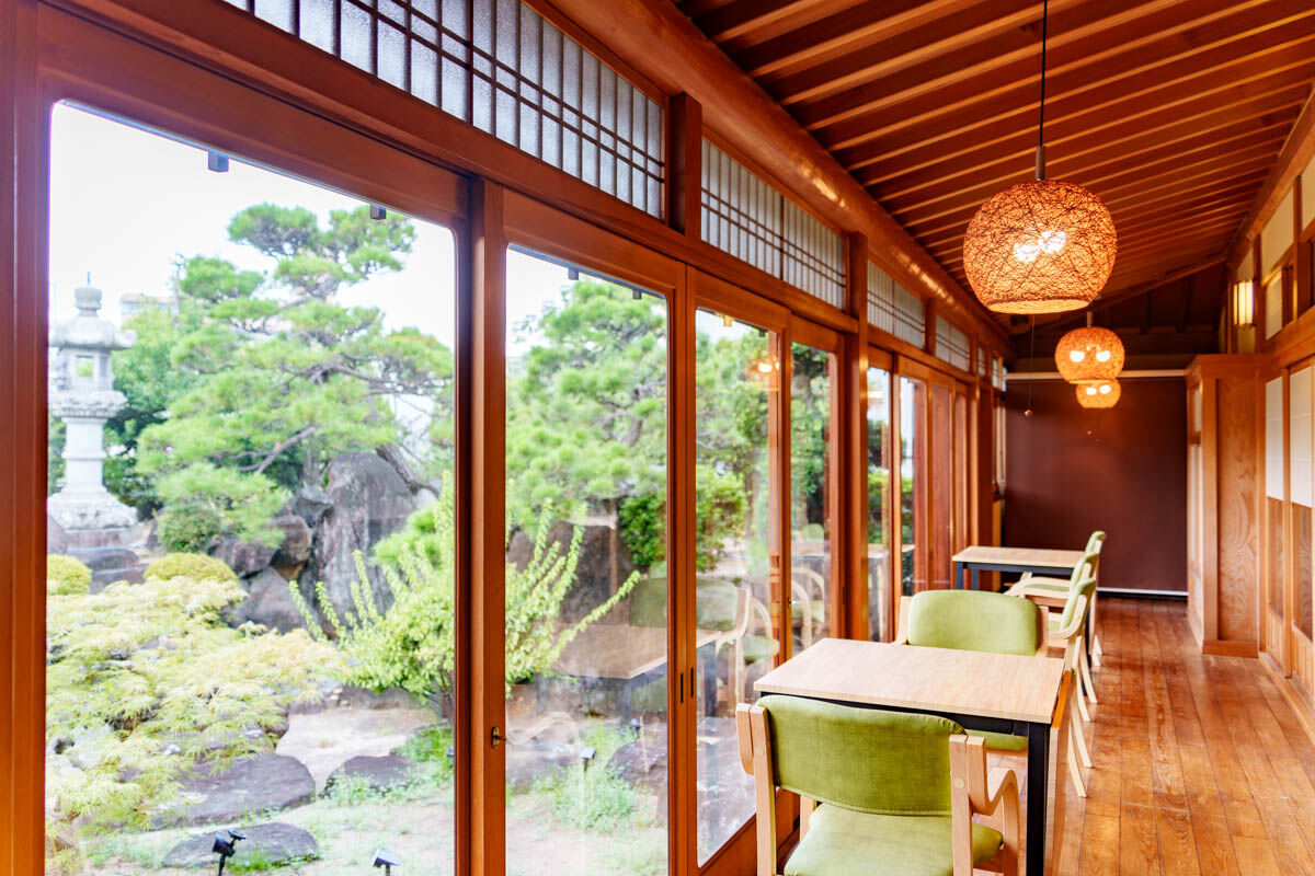 中から見るとこんな感じ。リノベーションしていてほとんど新品の綺麗な内観なのですが、立派な柱や欄間、窓枠など所々に古民家の名残があっておしゃれ。