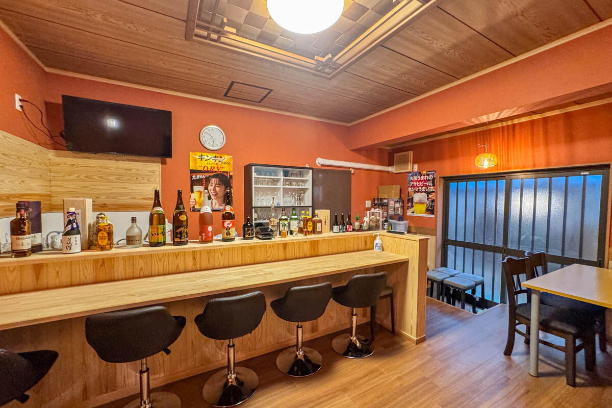 なんと、館内には和風BARというか小料理居酒屋のようなスペースが併設しています。すごい。宿泊者がお酒を楽しんだりできるそうですよ!