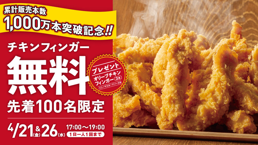 4月21日(金)と4月26日(水)の2日間、17:00~19:00の間で先着100名に「オリーブチキンフィンガー3本(ハニーマスタード付)」を無料でプレゼントしてもらえるそうですよ。
