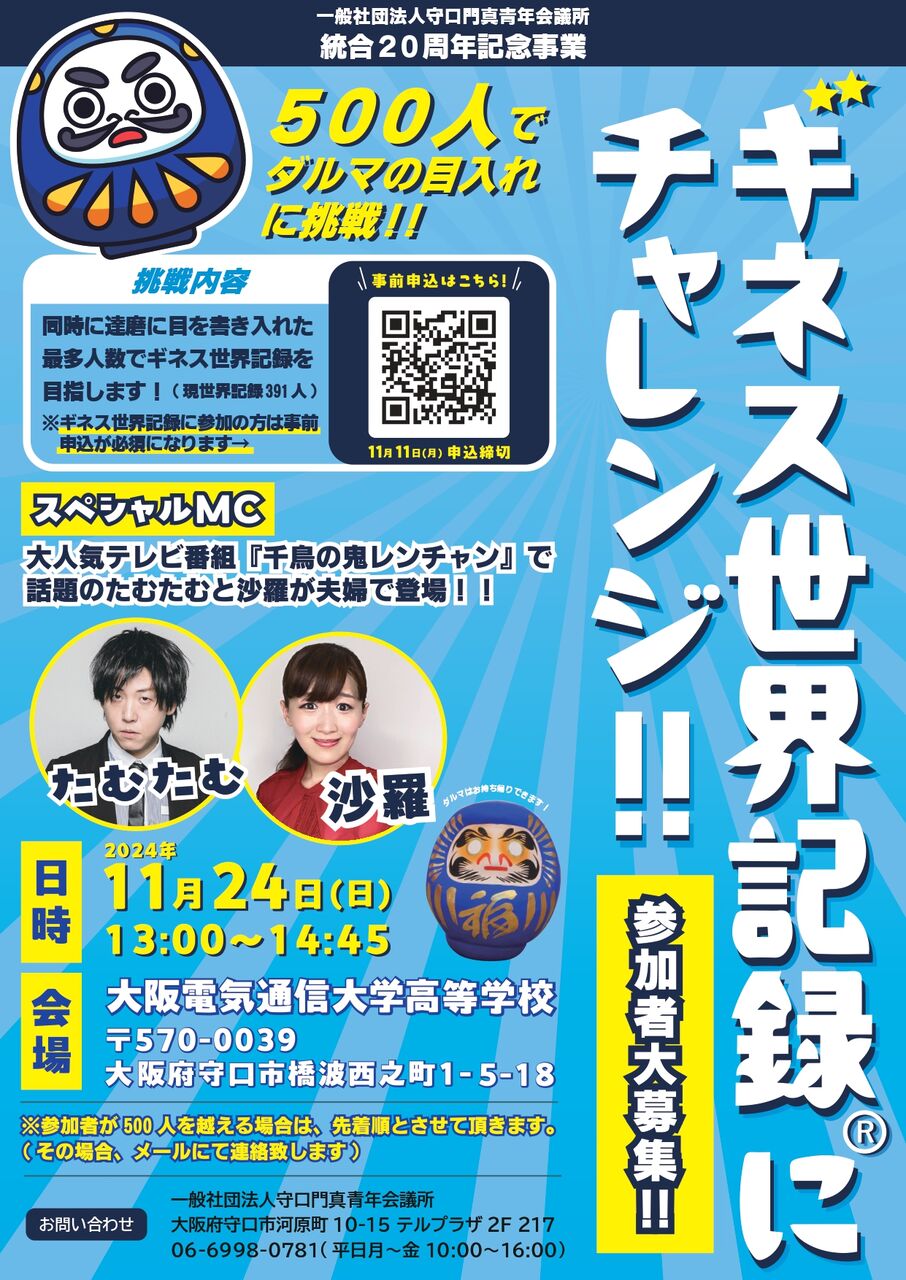 【守口】大阪電通大高で「同時にダルマに目を書き入れるギネス世界記録」にチャレンジするみたい。MCはたむたむ&沙羅。11月24日