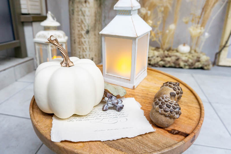 白を基調としてドライフラワーやアンティーク調な小物が置かれています。