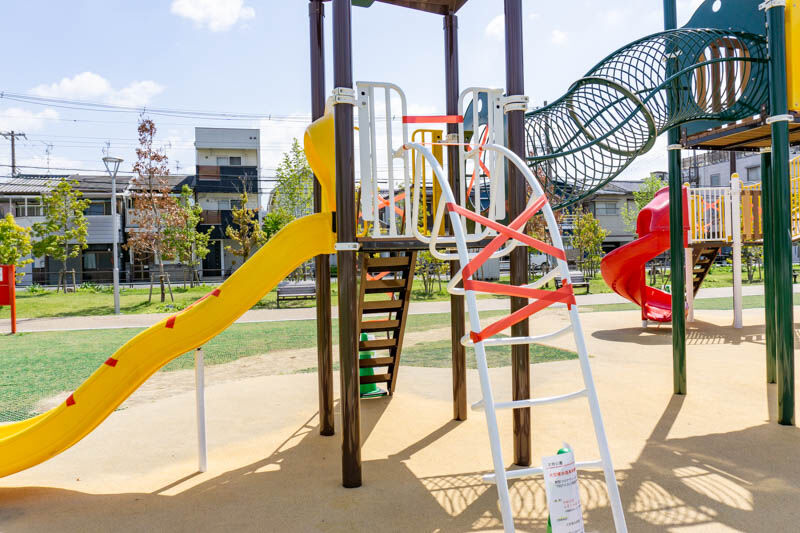 テープが貼られるなどして遊具にのぼれない状態に。