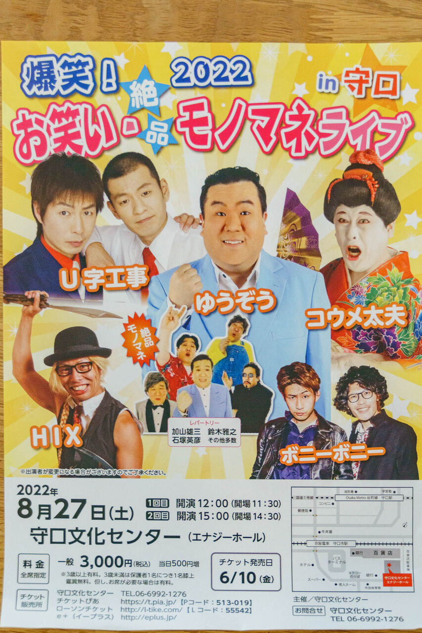上記によると、守口文化センターにて8月27日(土)「爆笑!2022 お笑い絶品モノマネライブ」を開催するとのこと。
