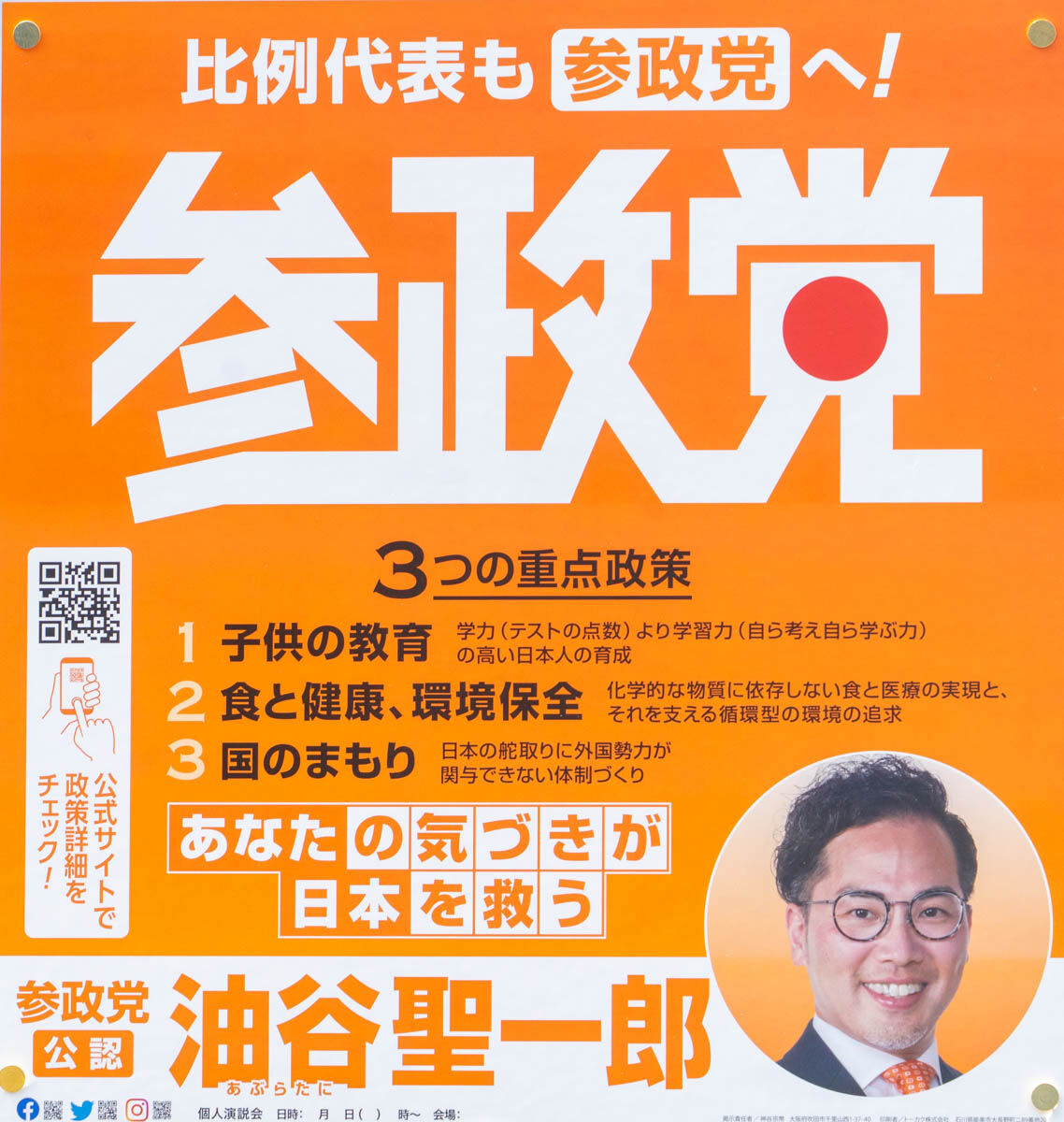 ■油谷 聖一郎(あぶらたに せいいちろう) / 参政党 / 公式サイト(記事作成時点ではつながらず)
