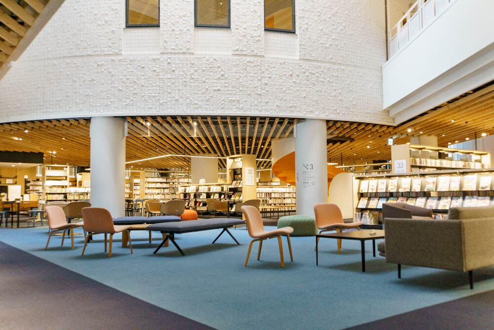 「滞在型の図書館」というコンセプトを掲げている守口市立図書館では、至るところに椅子など座れるスペースが用意されています。