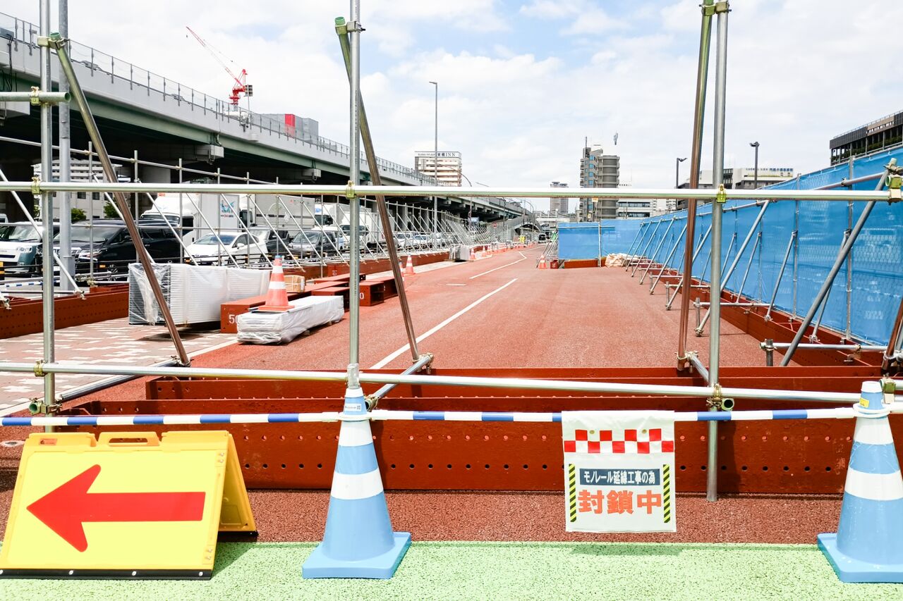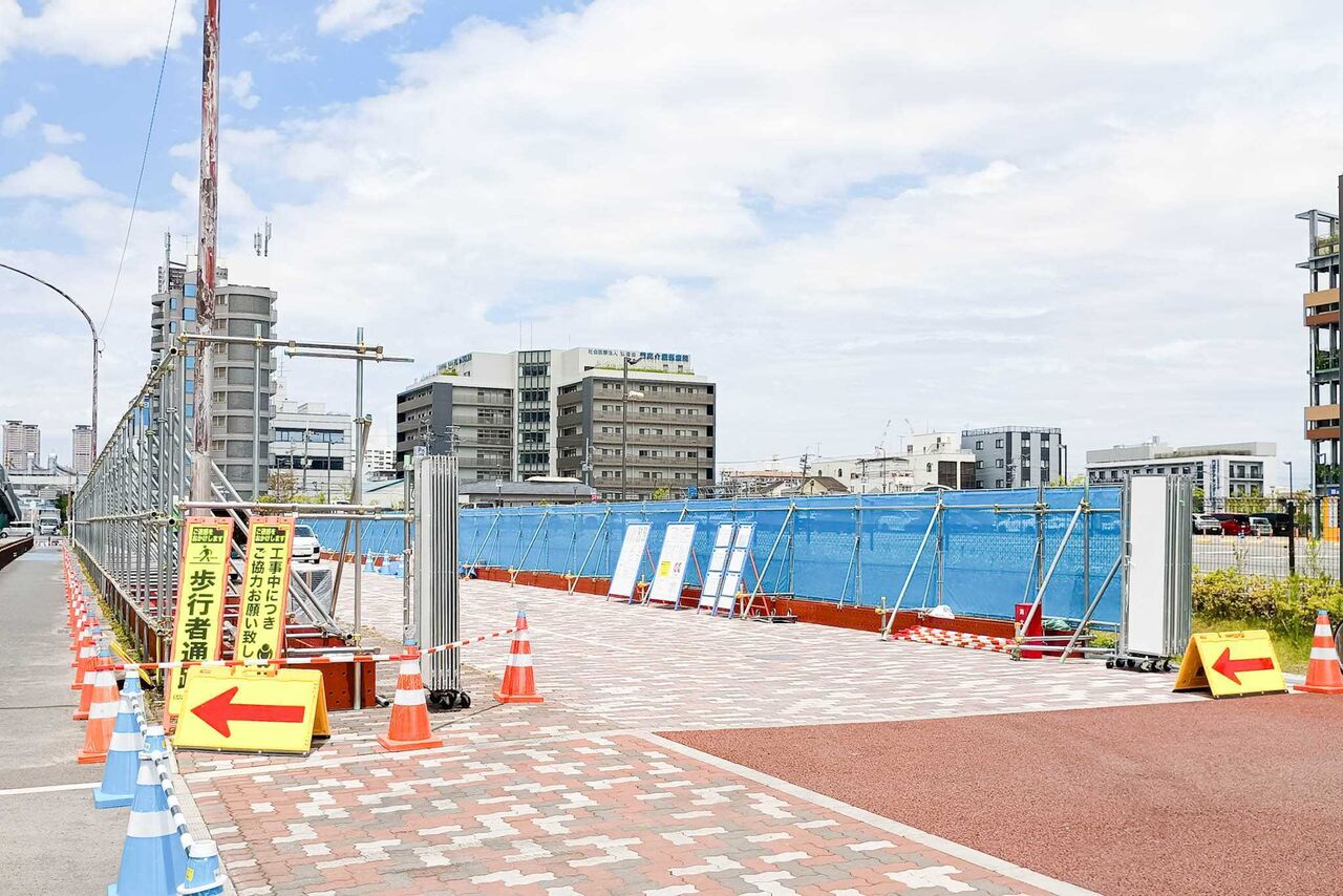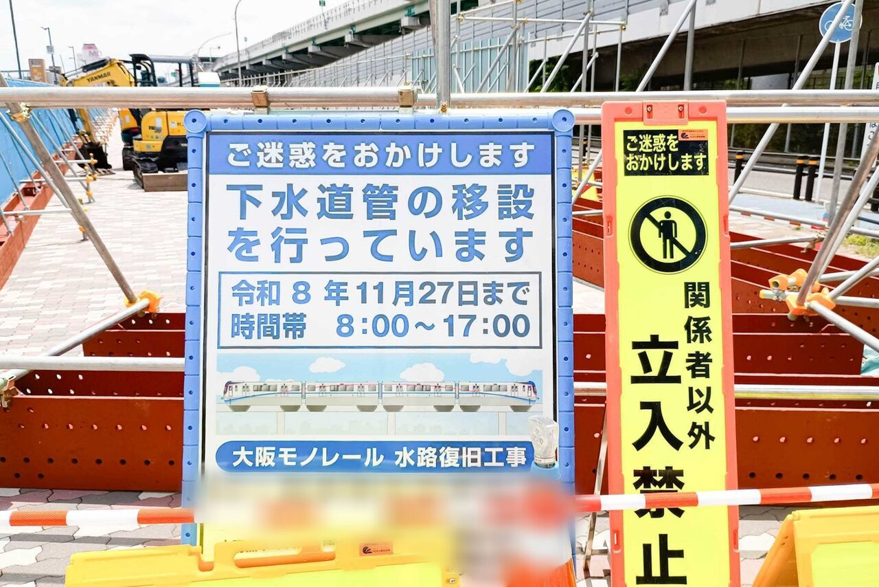 中環沿いを歩いていくと下水道管の移設工事を行っているという看板を見つけました。「大阪モノレール 水路復旧工事」と書いてあるので、モノレール延伸工事のために閉鎖しているかと思われます。