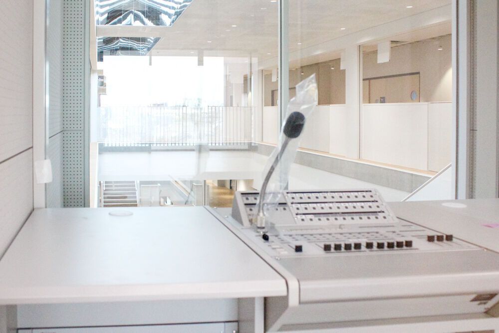 ここから室内に入ります。放送のブースはガラス張りになっていて、放送部はDJ感ある活動ができるんじゃないでしょうか。