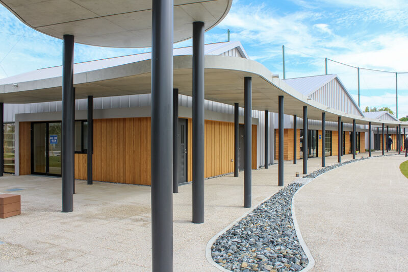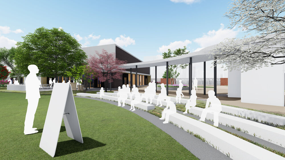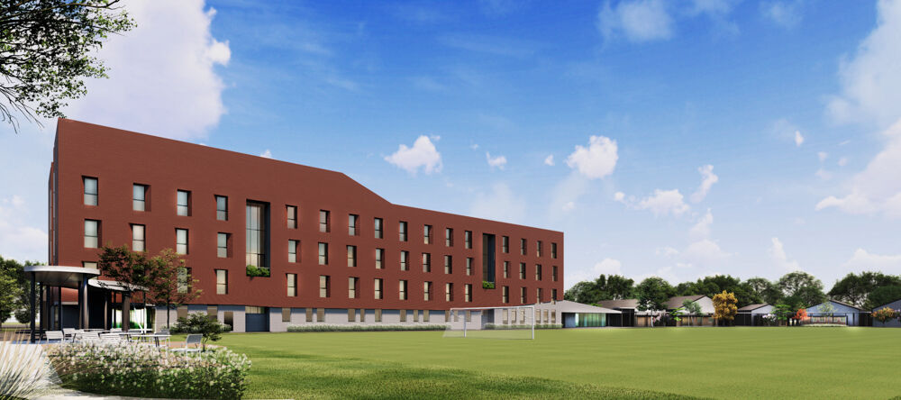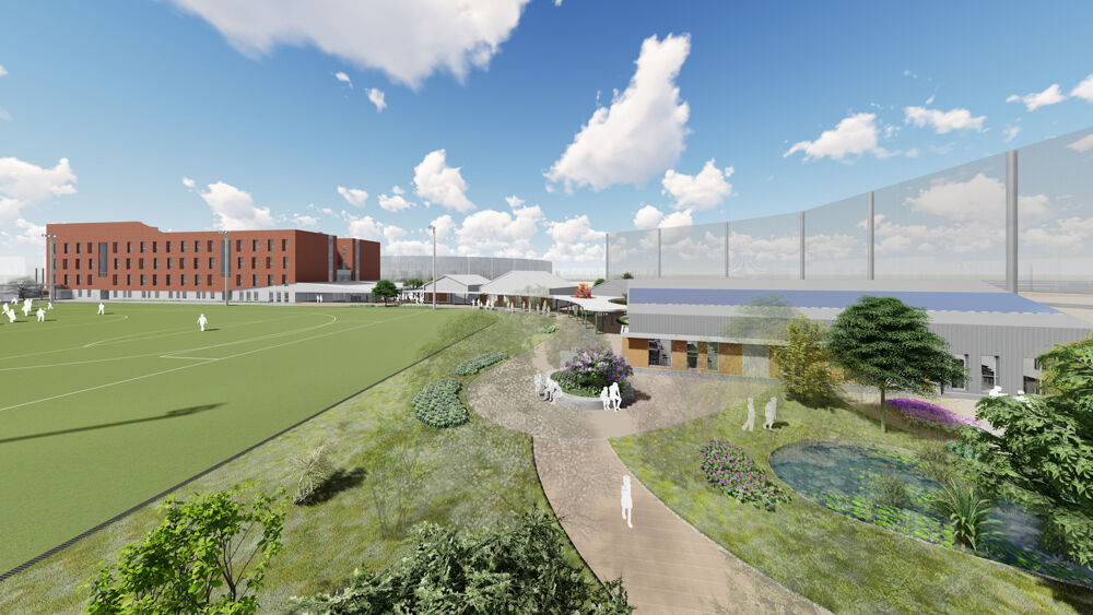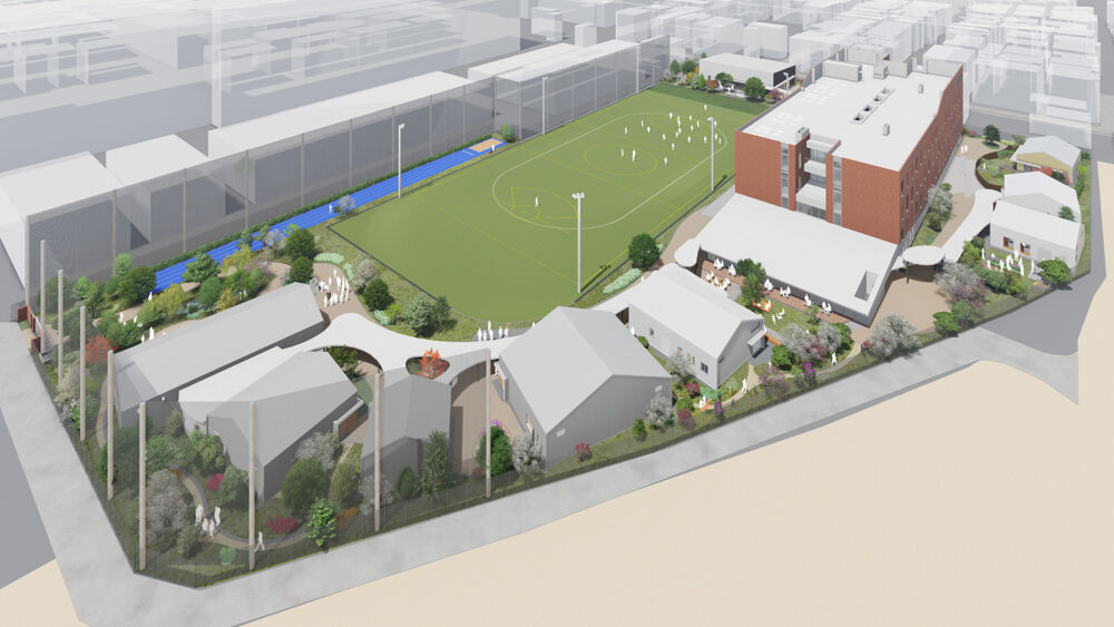 まずは南西からの茶色い校舎棟の外観とグラウンドが写ったこちらのイメージパース。