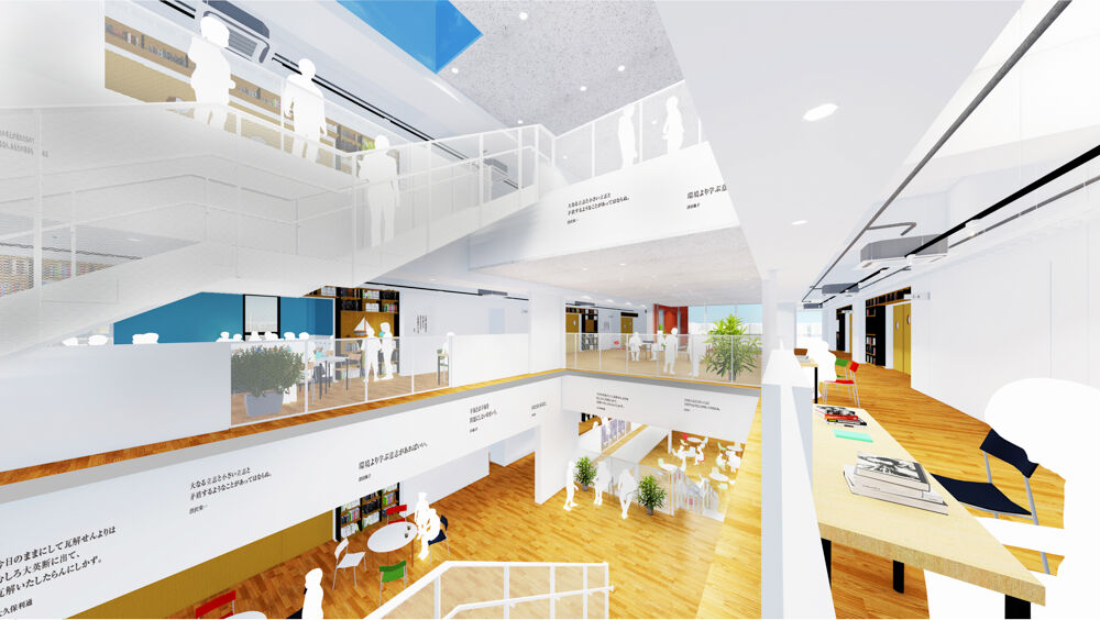 棟内は白と木目を基調としているようです。壁には名言が。
