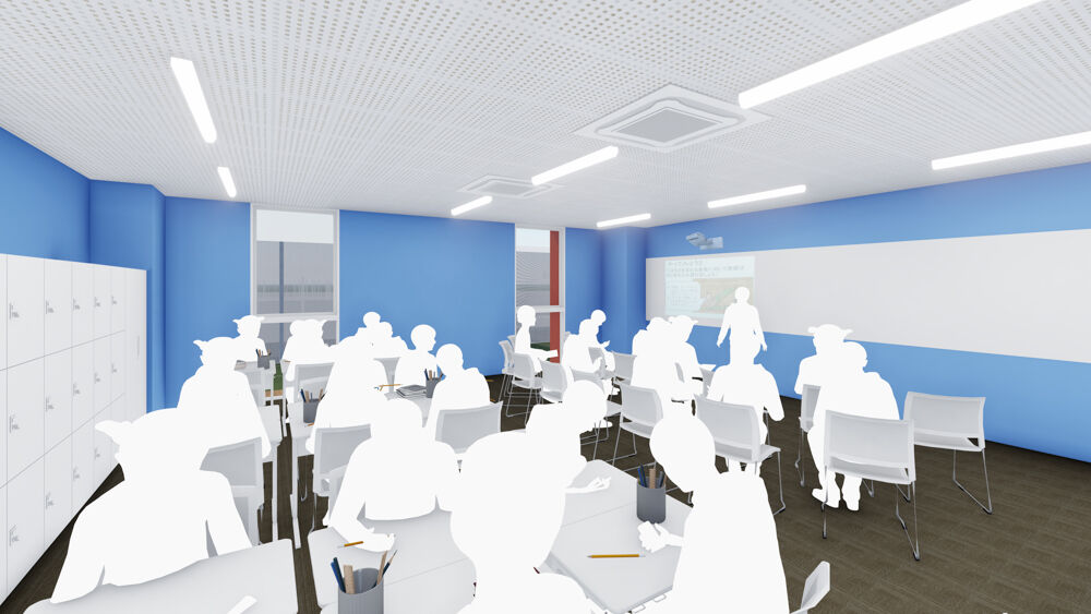 教室。青い壁紙が特徴的!