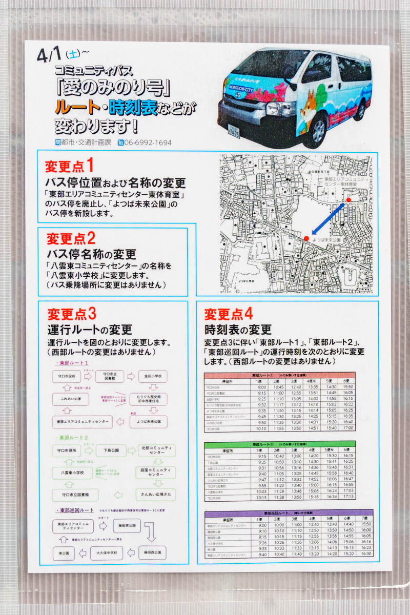 その代わりによつば未来公園の裏にある、東部エリアコミュニティセンターの東体育室前にある停留所が廃止になるようです。