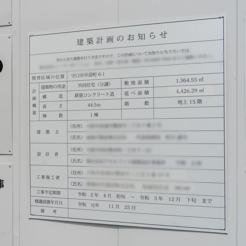 建築計画をみると、15階建てのマンションができることがわかります。工事は今年の12月下旬まで。
