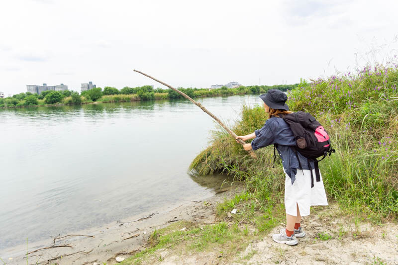 というわけで釣り人の真似で、そのへんに落ちてた木を持ってくれたチナ@もりつー。